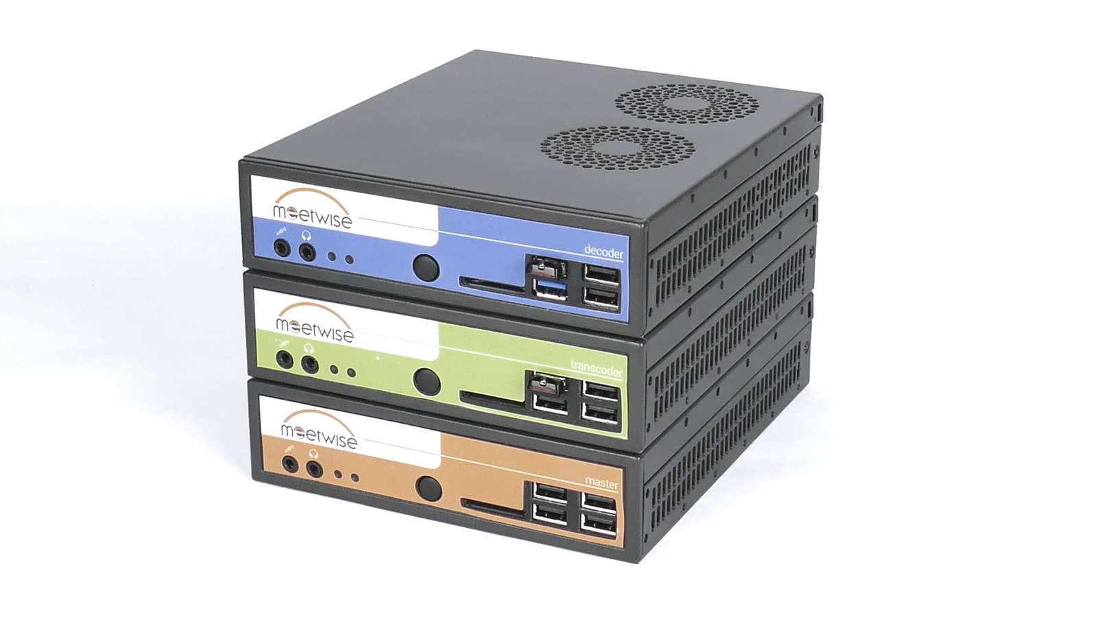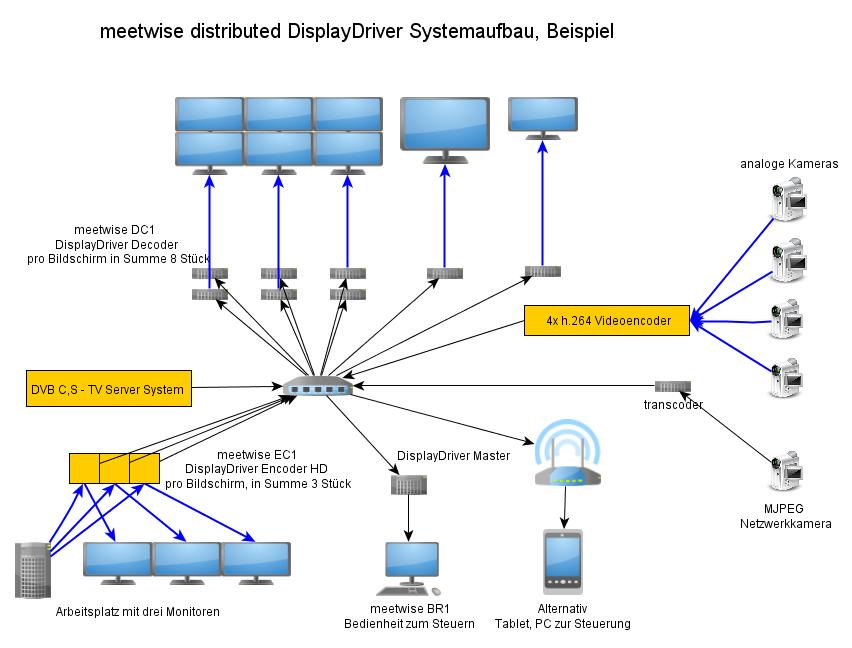 On the output side (sink) every display is connected to it own stand alone hardware (decoder - meetwise DC1) to display all available sources. Input wise (source) hard- and software sources are support to get the signals of various sources into the IP network.